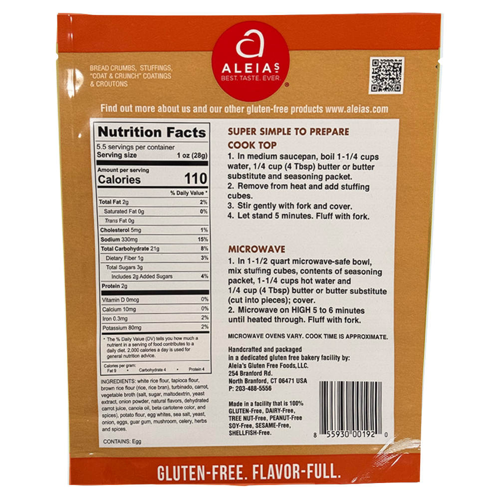 Made with our wholesome gluten-free bread, a rich, flavorful vegetable broth, plus a delightful blend of herbs and spices. Simple to prepare. Just add water and butter or butter substitute. Ready in five minutes!